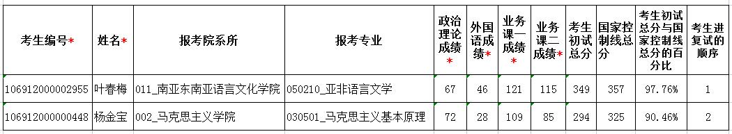 “退役大學生士兵計劃”考生進復試的方法為:考生初試總分與考生報考專業所在學科門類國家最低控制線總分的百分比,學校根據招生指標數優先安排百分比大的考生復試,參加復試資格審查考生名單如下: