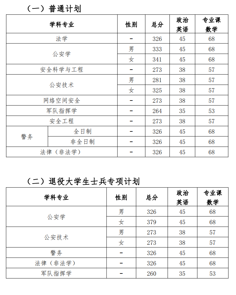 在國家線的基礎上,學校按照各學科(方向)招生計劃、上線生源情況和公安學科女生比例要求等情況,確定各學科進入復試(考察)分數最低要求如下: