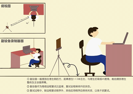 1.網絡遠程復試實行雙機位,一臺主設備用于正面拍攝,一臺輔助設備用于側后方監控拍攝。