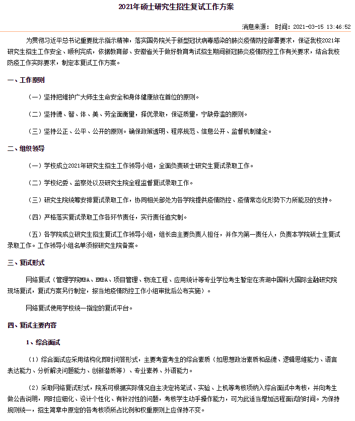 為貫徹習近平總書記重要批示指示精神,落實國務院關于新型冠狀病毒感染的肺炎疫情防控部署要求,保證我校2021年研究生招生工作安全、順利完成,依據教育部、安徽省關于做好教育考試招生期間新冠肺炎疫情防控工作有關要求,結合我校防疫工作實際要求,制定本復試工作方案。
