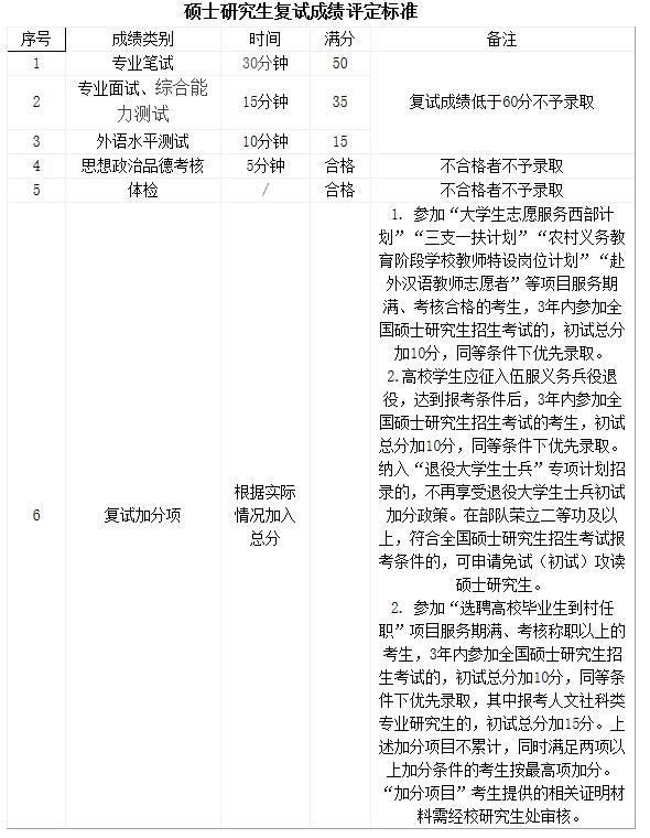 1、復試滿分分值為100分,其中專業課筆試45分,專業面試和綜合能力測試總計35分,外語水平測試15分,政治5分。復試中的思想政治品德考核和體格檢查,不計入復試總分,其成績計為合格與不合格。