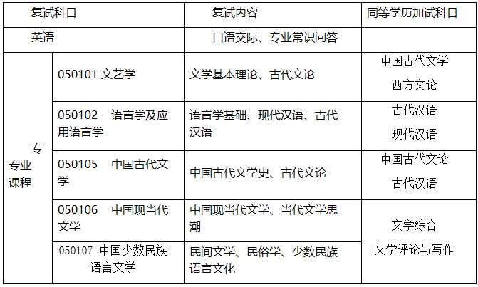 3.初試報考學科方向屬于中國語言文學一級學科,即專業代碼前4位為 0501。統考科目為政治、英語,非統考科目與我校初試科目相同或相近。我校僅接受統考外語科目為英語的考生,不接受其他語種考生。