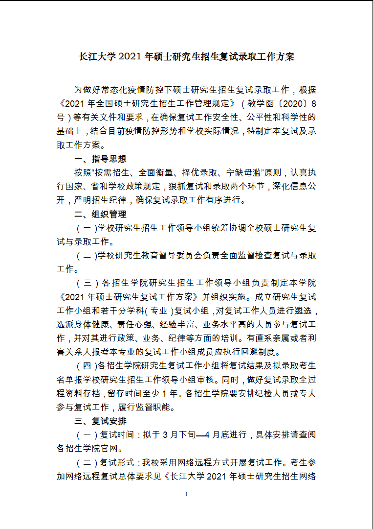 “長江大學2021年碩士研究生招生復試錄取工作方案”,其中,就2021考研復試時間和復試方式等內容做了詳細說明,原文內容如下: