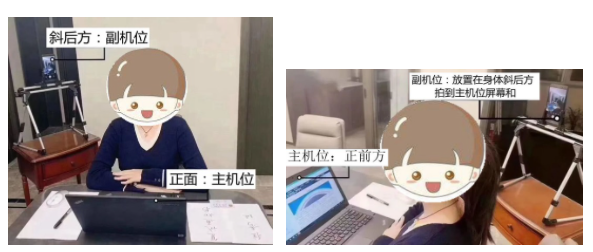 (三)主機位攝像頭正面對準考生本人,面試時正對攝像頭保持坐姿端正,雙手和頭部完全呈現在復試專家小組可見畫面中。副機位攝像頭從考生后方成45°放置,要保證考生和復試屏幕能清晰拍攝;