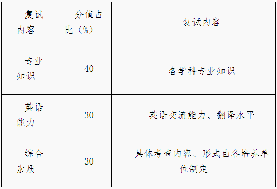 復試由各培養單位組織開展。復試主要是考核考生綜合運用專業知識分析和解決問題的能力、評判思維能力、舉止和語言表達能力、人文素養、心理素質等,實行百分制計分,包括專業知識、英語能力、綜合素質。復試成績低于60分不予錄取。具體各項賦值及復試內容見下表。