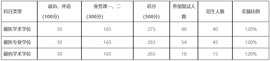 根據教育部公布的“2022年全國研招考試考生進入復試的初試成績基本要求”,結合我校今年招生規模和報考生初試成績匯總情況,經自治區教育廳審批,確定復試分數線。實行差額復試,差額比例原則上不低于120%。詳見《西藏藏醫藥大學2022年招生碩士研究生參加復試考生名單及成績》。