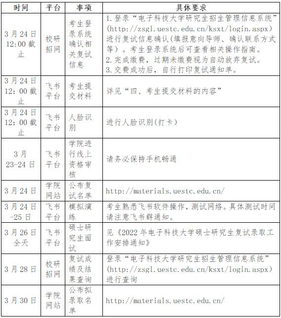 以上就是“2022考研復試安排_復試時間_復試方式:2022年電子科技大學材料與能源學院碩士研究生復試工作安排通知”的全部內容。更多內容請持續關注!