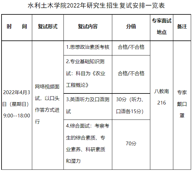 復(fù)試時間,內(nèi)容、分值及地點等見《水利土木學(xué)院2022年研究生招生復(fù)試安排一覽表》