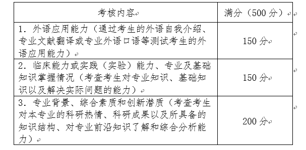 2.按專業組織面試,考察內容包括思想政治素質和品德、臨床能力或實踐(實驗)能力、專業知識、英語能力、綜合素質和創新潛質等等。考核方式和程序由考核小組自行確定。