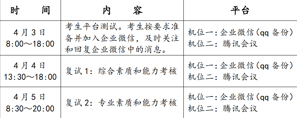 復試安排在4月4日、4月5日兩天進行。4月4日進行綜合素質和能力考核,4月5進行專業素質和能力考核。請考生合理安排計劃,在這兩個時間段做好網絡復試準備。