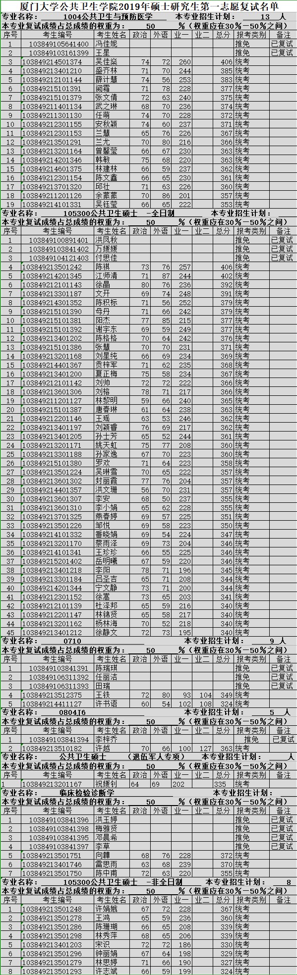 廈門大學公共衛生學院2019年碩士研究生第一志愿復試通知