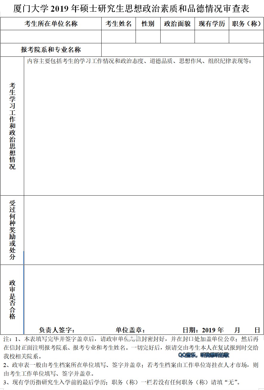 1. 填寫完整并密封完好的《廈門大學 2019年碩士研究生政治表現情況審查表》(該表可在廈門大學招生辦網頁:http://zs.xmu.edu.cn 下載) ;