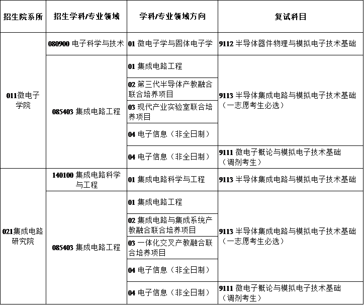 申請規則:微電子學院集成電路工程01、02、03方向一志愿復試合格且未被錄取考生,可選擇微電子學院集成電路工程01、02、03方向中平行志愿(如有缺額);集成電路研究院集成電路工程01、02、03方向一志愿復試合格且未被錄取考生,可選擇集成電路研究院集成電路工程01、02、03方向中平行志愿(如有缺額)。