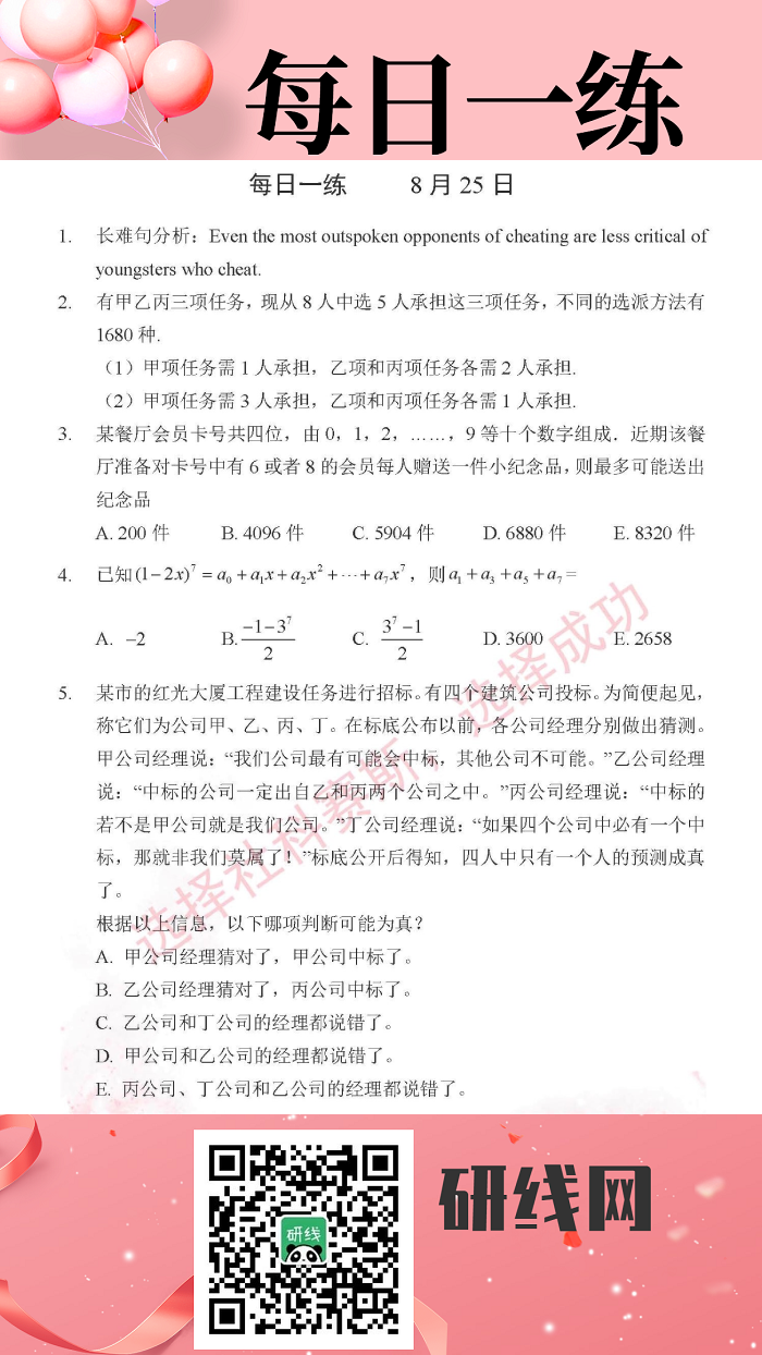 為了更好的復習和鞏固已經學過的知識,研線網小編為大家整理出幾道題,作為每日的練習,希望能夠幫助到同學們哦!