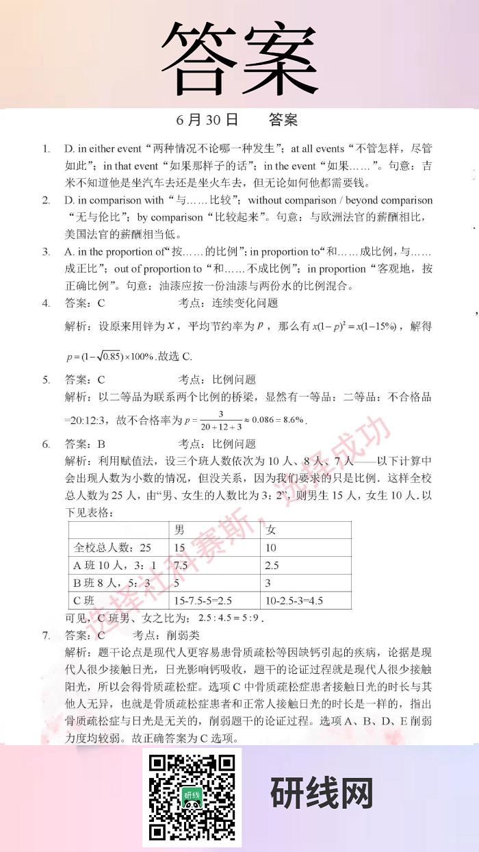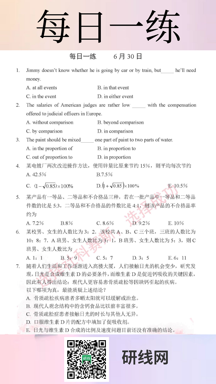 6月30日:2020管理類聯考每日一練以及答案