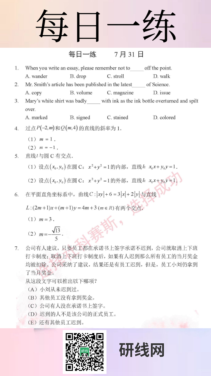 為了更好的復習和鞏固已經學過的知識,研線網小編為大家整理出幾道題,作為每日的練習,希望能夠幫助到同學們哦!