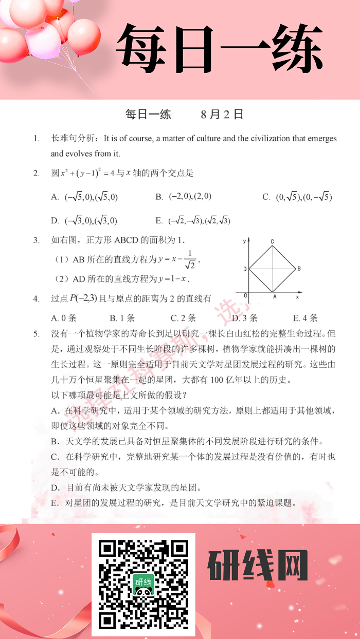 為了更好的復習和鞏固已經學過的知識,研線網小編為大家整理出幾道題,作為每日的練習,希望能夠幫助到同學們哦!