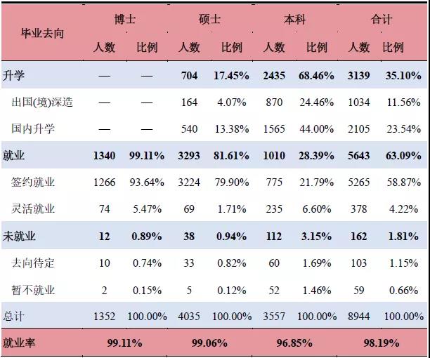 2019年畢業生就業率為98.19%。其中,簽約就業(含博士后)比例為58.87%,國內升學比例為23.54%,出國(境)深造比例為11.56%, 靈活就業比例為4.22%,暫不就業比例為0.66 %,去向待定比例為1.15%。