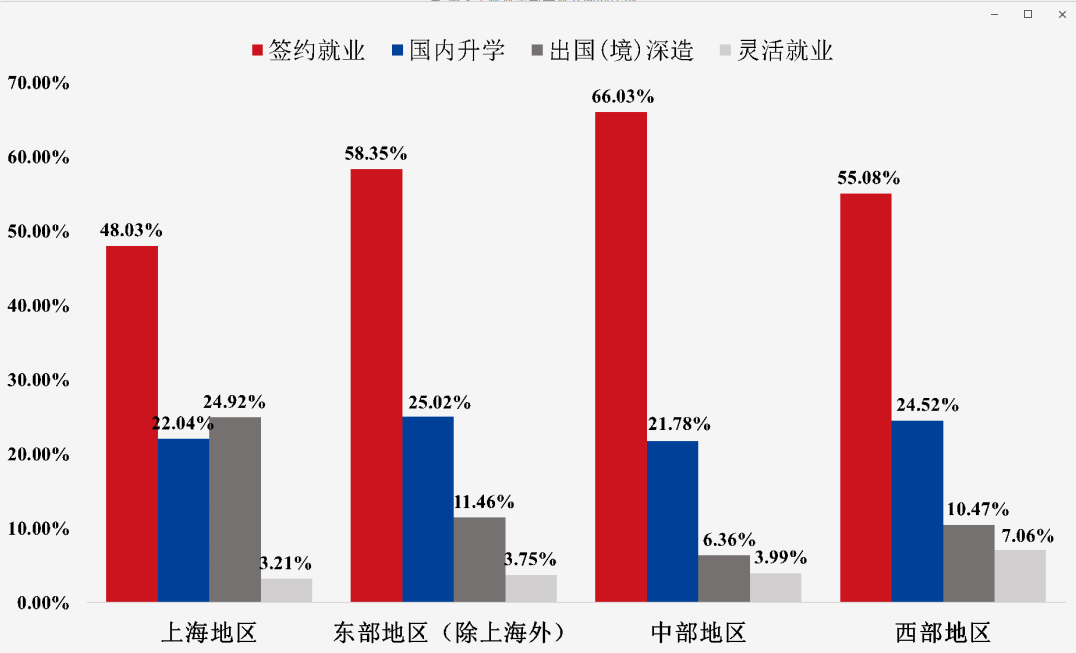 按生源地統計畢業去向,上海生源學生簽約就業比例為48.03%;東部各省市(除上海生源外)學生簽約就業比例為58.35%;中部各省市學生簽約就業比例為66.03%;西部各省市學生簽約就業比例為55.08%。