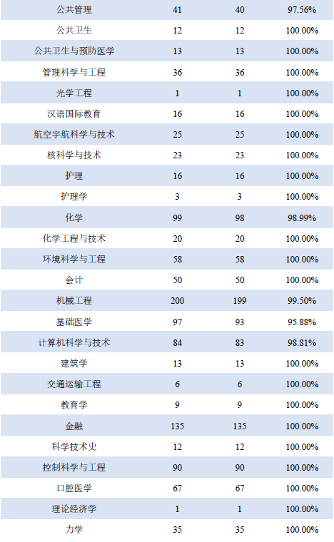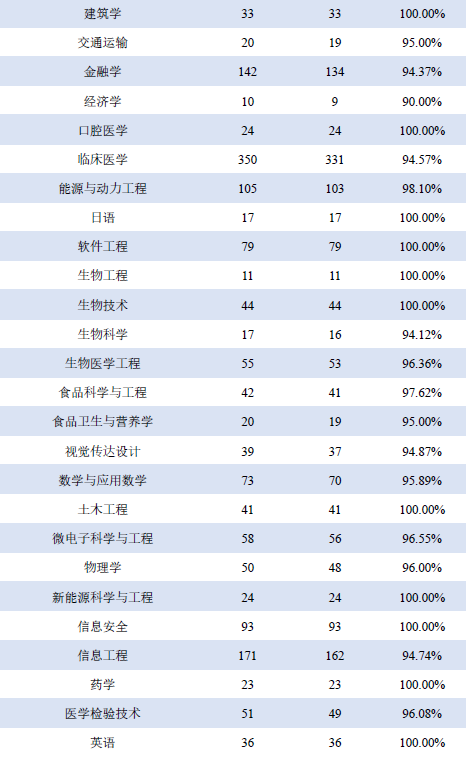 畢業生分布在31個院系(研究院、所)(以下簡稱為院系)。有28個院系畢業生就業率達到95%以上,占我校院系數的90.32%,其中 10 個院系畢業生就業率達到100%。