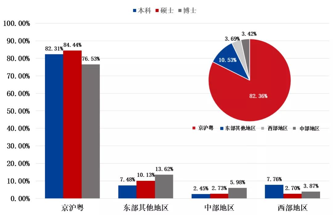 從就業地域來看,上海交通大學畢業生主要就業省市為上海市。博士生、碩士生和本科分別為772人、2407人和539人。除上海市外,我校畢業生就業人數較多的省市依次有:廣東省、浙江省、江蘇省和北京市。畢業生總體更傾向于在東部地區就業。