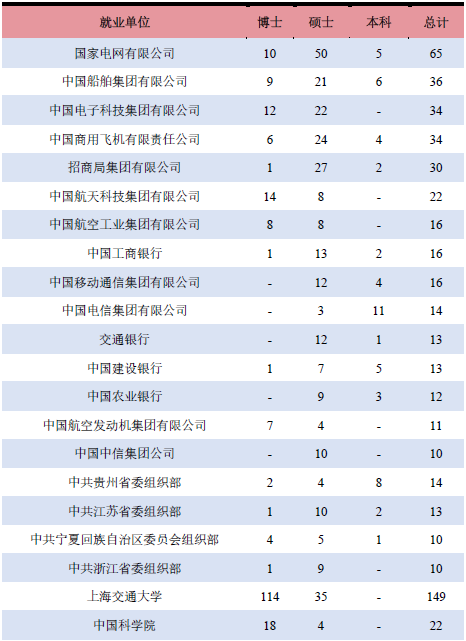 2019年上海交通大學畢業生就業人數超過10 人的就業單位達60家。目前,畢業生主要赴軍工、電力電網、通信、汽車、智能裝備制造、金融、醫療衛生、互聯網等行業領域就業。