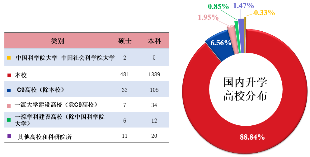 上海交通大學2019年畢業生中選擇國內升學的共有2105人。絕大多數留在本校升學,有1870人,比例為88.84%;其次C9高校(除本校外)有138人,比例為6.56%;第三為“一流大學”建設高校(除C9外)有41人,比例為1.95%。