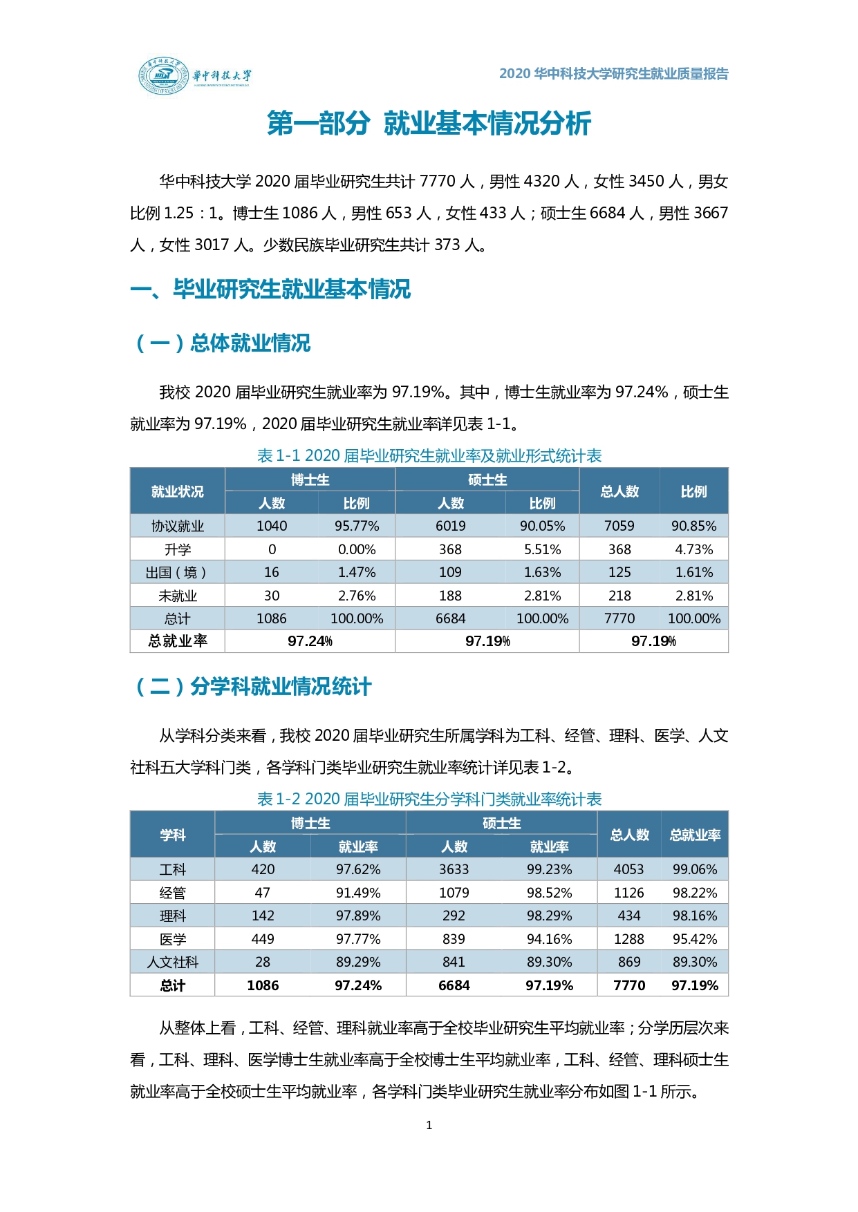 為全面反映我校研究生就業狀況,完善就業反饋機制,提升研究生就業質量,按照教育部統一工作部署,現將《2020華中科技大學研究生就業質量報告》予以發布。報告以2020年華中科技大學畢業研究生就業數據為準,統計日期截至2020年12月20日。