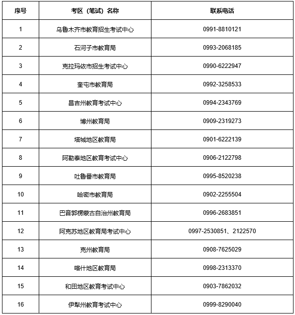 新疆各考區(筆試)工作聯系方式