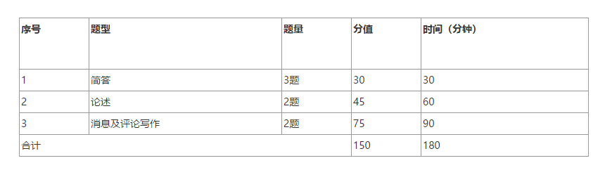 本考試包括三個部分:簡答、論述、消息及評論寫作。總分150分。