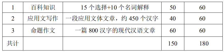 本考試包括三個(gè)部分:百科知識(shí)、應(yīng)用文寫(xiě)作、命題作文。總分 150 分。