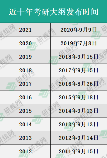 從歷年考研大綱發(fā)布時間來看,主要集中在9月上旬,最晚也沒有超過9月15日。