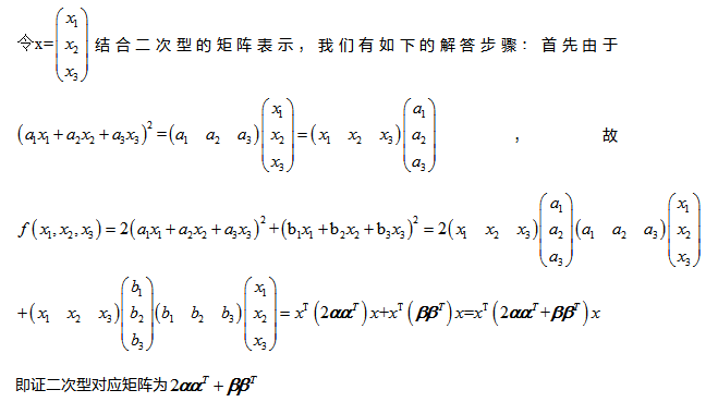 由于二次型與它的實對稱矩陣式一一對應的,所以二次型的很多問題都可以轉化為它的實對稱矩陣的問題,可見正確寫出二次型的矩陣式處理二次型問題的一個基礎。我們分析