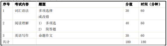 本考試包括以下部分:詞匯語法、閱讀理解、英語寫作等。總分為 100 分。