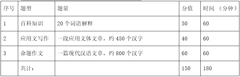 本考試包括三個部分:百科知識、應用文寫作、命題作文。總分150分。