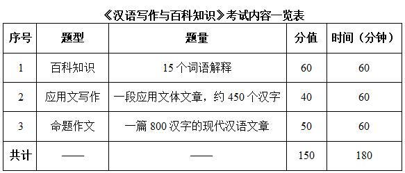 本考試包括三個部分:百科知識、應用文寫作、命題作文。總分150分。