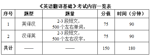 重點考察考生的英漢互譯專業技能和潛質,總分150分。《漢語寫作和百科知識》重點考察考生的現代漢語寫作水平和百科知識,總分150分。