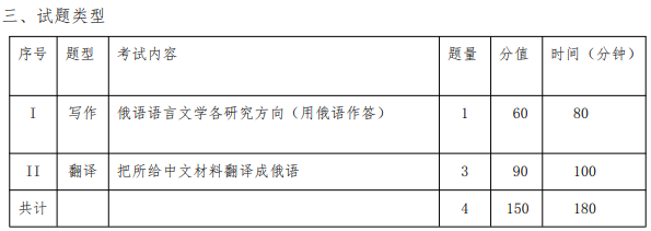 翻譯部分要求考生運用翻譯的基礎(chǔ)理論和技巧,將一般文學(xué)作品的節(jié)選、我國報刊雜志上的論述文和國情介紹,學(xué)術(shù)理論文獻(xiàn)等翻譯成俄語。譯文必須忠實原意,語言通順。