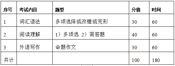 本考試包括以下部分:詞匯語法、閱讀理解、外語寫作等。總分為100分。