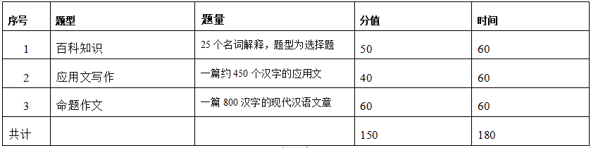 本考試包括三個(gè)部分:百科知識、應(yīng)用文寫作、命題作文。總分150分。