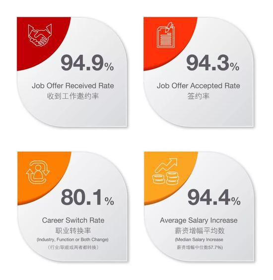 在薪資待遇方面,本屆畢業生的薪資中位數為年薪人民幣50萬元,超過七成(70.8%)的學生年薪在30萬到70萬之間,整體薪酬水平較MBA入學前增長94.4%。