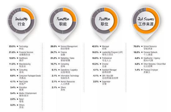 從行業趨勢來看,今年科技行業對MBA人才需求最大,緊隨其后的是金融服務業、醫療、制造業(工業品)和咨詢行業等。在職能分布上,從事綜合管理、金融、營銷/銷售的畢業生占比超過七成(71.9%)。
