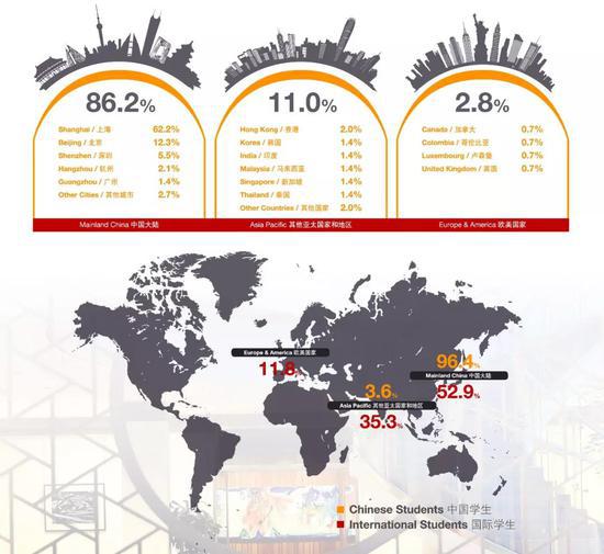 86.2%的2019屆畢業生在中國大陸就職,其余分布在亞、美、歐多國。國際學生就業分布國家的數量(亞太地區)較往年有大幅增長——已簽約的國際學生中,有88.2%選擇將亞洲作為畢業后的職業發展目的地,有52.9%成功在中國大陸地區就業。