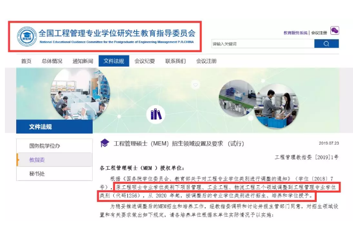 2019年7月,全國工程管理專業學位研究生教育委員會和清華大學工程管理碩士教育中心在清華大學舉行的一次會議,此次會議發布了一項重磅文件《工程管理碩士(MEM)招生領域設置及要求(試行)》。