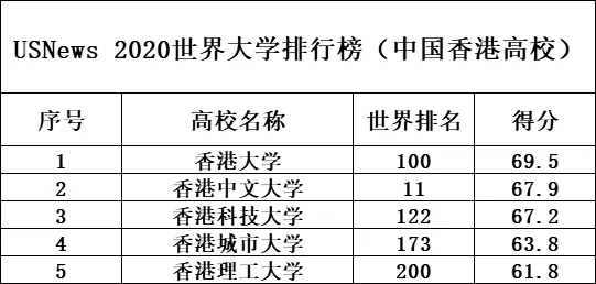 USNews 2020世界大學(xué)排行榜(中國香港高校)入圍前200名榜單