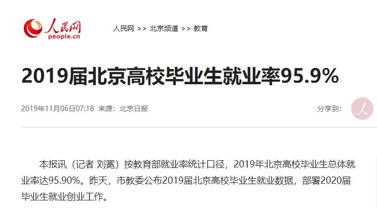 本報訊(記者 劉冕)按教育部就業率統計口徑,2019年北京高校畢業生總體就業率達95.90%。昨天,市教委公布2019屆北京高校畢業生就業數據,部署2020屆畢業生就業創業工作。
