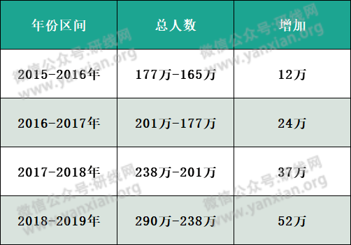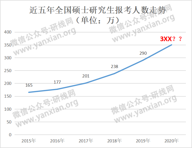 2019年考研報名人數290萬,比2018年多52萬,結合近5年報考人數和趨勢來看,可以得出,2020考研報考人數肯定會增加,預計不低于320萬!