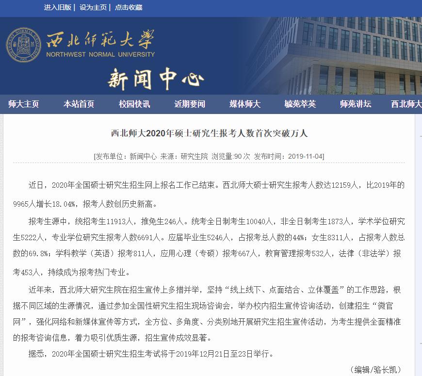 近日,2020年全國碩士研究生招生網上報名工作已結束。西北師大碩士研究生報考人數達12159人,比2019年的9965人增長18.04%,報考人數創歷史新高。