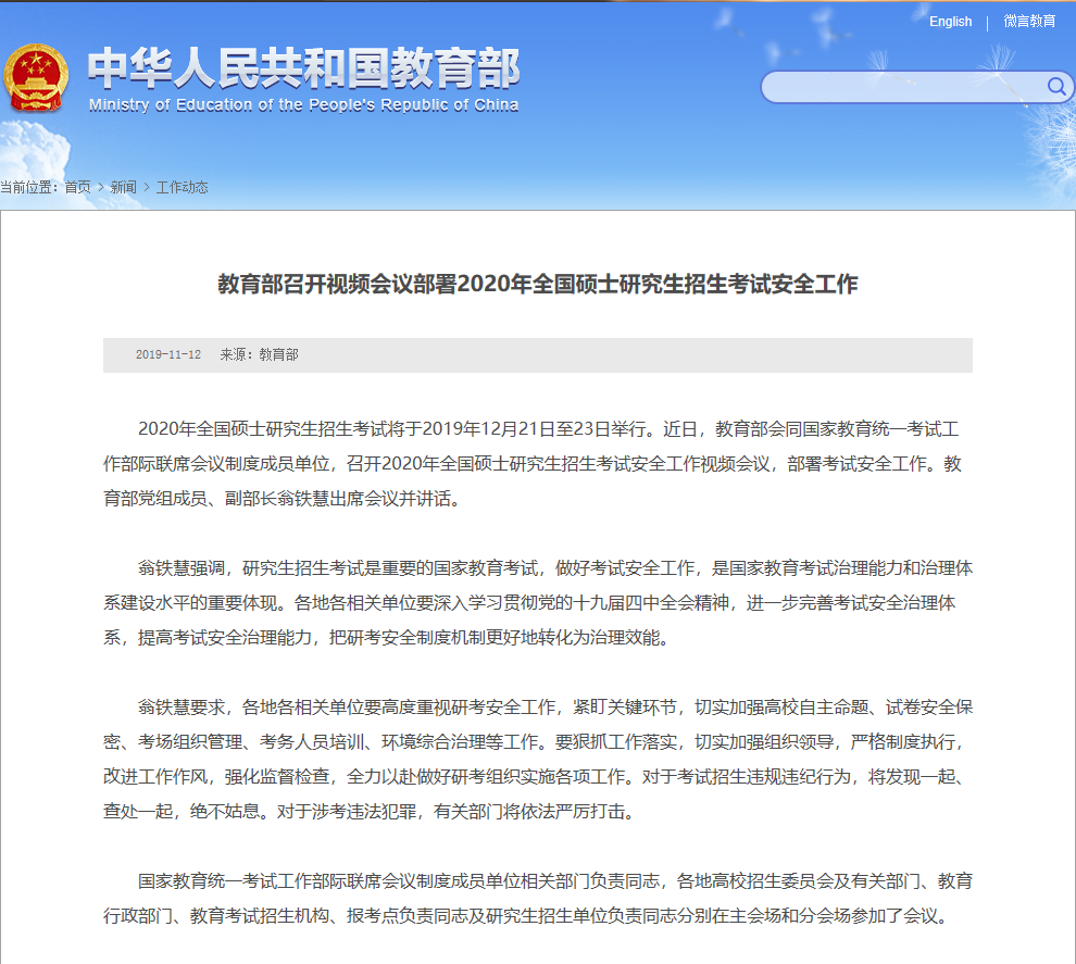 翁鐵慧強(qiáng)調(diào),研究生招生考試是重要的國家教育考試,做好考試安全工作,是國家教育考試治理能力和治理體系建設(shè)水平的重要體現(xiàn)。各地各相關(guān)單位要深入學(xué)習(xí)貫徹黨的十九屆四中全會精神,進(jìn)一步完善考試安全治理體系,提高考試安全治理能力,把研考安全制度機(jī)制更好地轉(zhuǎn)化為治理效能。