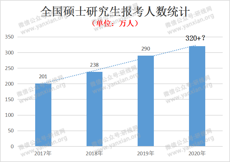 2019年全國考研報名人數達到了史無前例的290萬人,比2018年考研人數增加了52萬人,增幅達到了21.8%,考研增加人數和增長率均為近年來最高。2020考研報名人數320萬+?讓我們期待官方消息——
